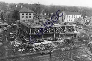 Description/History:A black and white photo of City Utilities Office Building in Springfield, MO. This view taken from top of courthouse E. Central St. Carnegie Library in background.