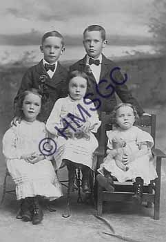 | Accession Number:1988-68-34 Accession Date: Condition:good Location:diocese, box 1, folder 34 Keywords:Nast, children, diocese Area of Origin:Denver, CO Period:ca. 1900 Category:documentary artifact Object:print, photographic Maker:Cor. 16th and Curtis Stu. Description/History:A black and white photo of five small shildren posing with a teddy bear and a fake kitten. The girls are in the front row and the boys are in the back. A silver embossed crest reads: "Nast" which could possibly be the family name. The photo is contained in a brown cardboard folder with a cream matte and a protective covering of paper. The photo is practically in mint condition. News-Leader Photo Information: |
