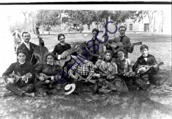 | Accession Number:1989-210-2 Accession Date: Condition:fair Location:Archives, Hall Coll., Box 1, Folder 2 Keywords:men, women, entertainment, club, organizations, musical instruments, Drury Mandolin Club, guitar, cello, Fairbanks Hall, Charles H. Wilson (?), Theron Catlin Bennett, Lum Hall Frey, Donald Rust, Gen Kearney, Anna Miller, Kate Holbrook, Byron Smith Area of Origin:Springfield MO Period:ca 1905 Category:Documentary Artifact Object:Print, photographic Maker:Byron H. Smith Description/History:9" x 12" mounted black and white photo of group of 10 students seated on lawn, playing guitars, mandolins, and cello in front of Fairbanks Hall at Drury College. Two boys in cadet uniforms were enrolled in the military program. News-Leader Photo Information: |