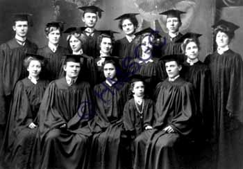 | Accession Number:1989-210-7 Accession Date: Condition:fair Location:Archives, Hall Coll., Box 1, Folder 7 Keywords:Drury College, men, women, graduation, 1- Emery Lowe, 2- Mamie Brockman, 3- Effie Sterrett, 4- Grant Johnson, 5- Ellen Craig, 6- Bertha Booth, 7- Evelyn Mucke, 8- George Sam Will, 9- Grace Williams, 10- Alice Ione Bennett, 11- Ed Hall (father of donor), Area of Origin:Springfield MO Period:1903 Category:Documentary Artifact Object:Print, photographic Maker:Wickizer, 420 South St. Description/History:11" x 14" (including mount) black and white photoprint of formal graduation photograph of 15 men and women in caps and gowns. ...(con't) 12- Professor Finkel's daughter, 13- Vera Brereton, 14- Charlie Orr, 15- Maude Little. News-Leader Photo Information: |