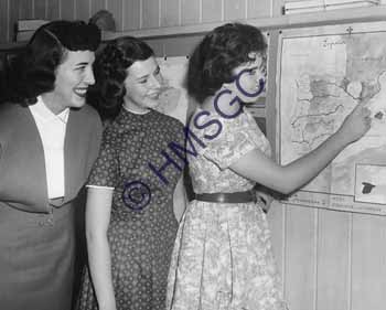 Accession Number:1992-232.143a Accession Date: Condition:good Location:Springfield Public Schools, box 1, folder 143 Keywords:public schools, education, women, map Area of Origin:Springfield, MO Period:ca. 1960 Category:documentary artifact Object:print, photographic Maker:John McGuire Description/History:A black and white photo of three women next to a map of Spain studying American Field Science. News-Leader Photo Information: