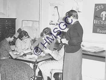 Accession Number:1992-232.1824 Accession Date: Condition:good Location:Springfield Public Schools, B5, F74 Keywords:Springfield Public Schools, education, students, journalism, Central High School. Area of Origin:Springfield, MO Period:ca. 1960 Category:documentary artifact Object:print, photographic Maker:unknown Description/History:A black and white photo of 4 female journalism students, working on a project, with their teacher. News-Leader Photo Information: