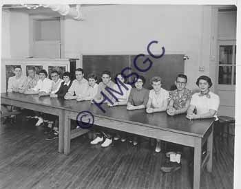Accession Number:1992-232.1849 Accession Date: Condition:good Location:Springfield Public Schools, B5, F78 Keywords:Springfield Public Schools, education, students, high school. Area of Origin:Springfield, MO Period:ca. 1955 Category:documentary artifact Object:print, photographic Maker:John E. Craig, Jr. Description/History:A black and white photo of 13 high school students--6 male and 7 female--seated in a row at a table. News-Leader Photo Information: