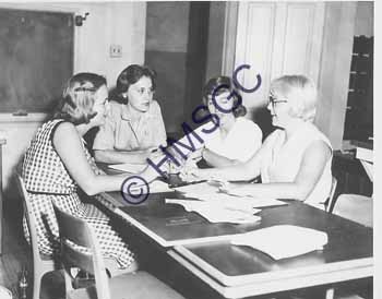 Accession Number:1992-232.1857 Accession Date: Condition:good Location:Springfield Public Schools, B5, F80 Keywords:Springfield Public Schools, education, students. Area of Origin:unknown Period:ca. 1955 Category:documentary artifact Object:print, photographic Maker:unknown Description/History:A black and white photo of four female students all seated and talking while doing their school-work. News-Leader Photo Information:
