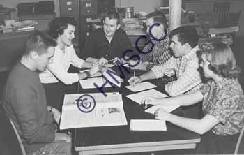 Description/History:A black and white photo of four male and three female journalism students seated around a table at Central High School.