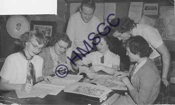 Accession Number:1992-232.1879 Accession Date: Condition:fair Location:Springfield Public Schools, B5, F87 Keywords:Springfield Public Schools, education, students, journalism. Area of Origin:unknown Period:ca. 1950 Category:documentary artifact Object:print, photographic Maker:unknown Description/History:A black and white photo of five female and one male journalism students working on the school yearbook. News-Leader Photo Information: