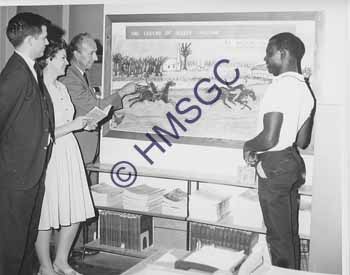 | Accession Number:1992-232.1931 Accession Date: Condition:good Location:Springfield Public Schools, B5, F106 Keywords:Springfield Public Schools, education, The Legend of Sleepy Hollow, Central High School, Dale Burns, Naomi Pendergrat. Area of Origin:Springfield, MO Period:ca. 1960 Category:documentary artifact Object:print, photographic Maker:unknown Description/History:A black and white photo of three men and one woman looking at a drawing (placed on a bulletin board) of the Legend of Sleepy Hollow. News-Leader Photo Information: |