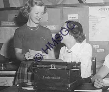 | Accession Number:1992-232.1955 Accession Date: Condition:fair Location:Springfield Public Schools, B5, F118 Keywords:Springfield Public Schools, education, Central High School, yearbook. Area of Origin:Springfield, MO Period:ca. 1950 Category:documentary artifact Object:print, photographic Maker:unknown Description/History:A black and white photo of two female Central High School students on the yearbook staff. One student is seated at a typewriter while looking at a picture with the student standing to the right of her. News-Leader Photo Information: |