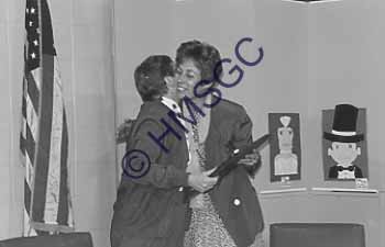 Accession Number:1992-232.219 Accession Date: Condition:good Location:Springfield Public Schools, box 1, folder 219 Keywords:public schools, education, Kraft Area of Origin:Springfield, MO Period:1990 Category:documentary artifact Object:print, photographic Maker: Description/History:A color photo of Jackie McKinsey and Jan Wooten embracing at Kraft Administrative Center board officers change. News-Leader Photo Information: