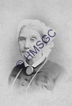 Sepia tone mounted cabinet card photo of an unidentified older woman in a white lace cap.