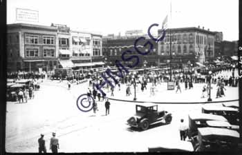 | Accession Number:1994-103 Accession Date: Condition:fair Location:Archives photo collection, Pub Sq, Box 1 folder 50 Keywords:Public Square, parade, Levy-Wolf, Union National Bank, Martin's Pianos, Hamilton Shoe Stores, St. Louis Street, South Ave., automobile, baseball Area of Origin:Springfield, MO Period:8/29/1923 Category:Documentary Artifact Object:Print, photographic Maker:uk Description/History:Black and white photo of the southeast quadrant of the Springfield Public Square. A parade is in progress, flag in center of "pie" at half staff for Harding's death, a sign in the center of the "pie" announces, "Baseball Today." Identifiable businesses include: Levy-Wolf, Union National Bank, Martin's Pianos, Hamilton Shoe Stores,South Ave,St. Louis St. News-Leader Photo Information: |
