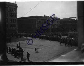 | Accession Number:1994-111 Accession Date: Condition:fair Location:archives,photo coll.,public square,box 2,folder 8 Keywords:public square, parade, the Model, Martin Bros. Pianos, St. Louis St., Holland Building Area of Origin:Springfield, Mo. Period:1919 Category:Documentary Artifact Object:Print, photographic Maker:Uk Description/History:A military parade is marching on St. Louis St. and are entering the public square. The Holland Banking Co. is on the right. On top of the third building is a sign that reads " The Model ". In the background is another sign that reads " Martin' s Piano ". Also in the background is the Union National Bank. It should be noted that the square is paved with paving bricks. News-Leader Photo Information: |