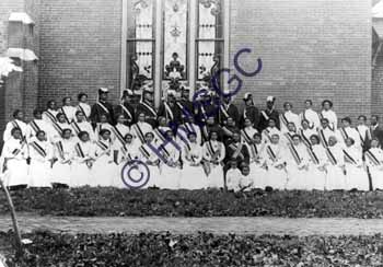 | Accession Number:1994-164-1 Accession Date: Condition:fair Location:Archives, Black History Coll., Box 1, Folder 2 Keywords:African-American, Fraternal orders, churches, Eureka Chapter, Eastern Star, Freemason, Washington Ave. Baptist Church Area of Origin:Springfield, MO Period:ca 1895 Category:Documentary Artifact Object:Print, photographic Maker: Description/History:9-3/4" x 7-3/4" (print area only) sepia tone photoprint of black men and women of a fraternal order, Eastern Star (Freemasons), posed by Washington Ave. Baptist Church. Springfield was a segregated town, which included fraternal orders and churches. News-Leader Photo Information: |