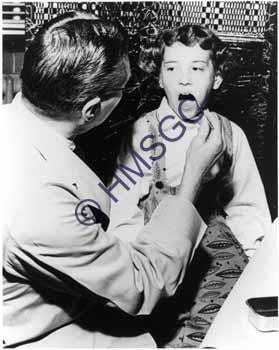 Accession Number:1994-35-7 Accession Date: Condition:fair Location:archives,photo coll.,schools,box3,folder11 Keywords:Weaver School, Dr. Frank Canedy, dentists Area of Origin:Springfield, MO Period:1-30-58 Category:Documentary Artifact Object:Print, photographic Maker:uk Description/History:Black and white photo of a young girl being examined by the school dentist, Dr. Frank Canedy, at Weaver Elementary. News-Leader Photo Information: