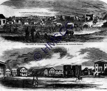| Accession Number:1994-57 Accession Date: Condition:fair Location:Archives photo collection, Pub. Sq. Box 1 folder 5 Keywords:Public square, , court house old and new, state bank, United States hospital, town of Springfield, MO Area of Origin:Springfield, MO Period:1861 Category:Documentary Artifact Object:Print, photographic Maker:Alexander Simplot Description/History:Black & white photo of a reproduction from Harper's Weekly of two views of Springfield, one the public square showing the new (1860) courthouse and the old red brick courthouse in the middle of the square that burned during the Civil War. The other is a general view of Springfield looking east with the courthouse in the upper right of the sketch. News-Leader Photo Information: |
