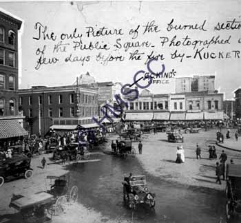 | Accession Number:1994-85 Accession Date: Condition:fair Location:Archives photo collection, Pub Sq, Box 1 folder 32 Keywords:Public square, Nathan Clothing Co., Heers, National Bank, C. C. King, Osborn Jewelers, Weaver's Shoes,transportation, buggies,automobiles,fire, Widbin and Fox,Boonville Ave., St. Louis St. Area of Origin:Springfield, MO Period:1913 Category:Documentary Artifact Object:Print, photographic Maker:Kucker Description/History:Black and white photo,mounted on cardboard, of Springfield Public Square, northeast quadrant. "Pie" on extreme right of photo, cars, horses and buggies and people filling the walks. Identifable businesses are: Nathan's Clothing, National Bank, Osborne jewelers, Weaver Shoes, Widbin and Fox, Reps. Labeled as the only photo taken of the northeast corner of the square which burned several days later. News-Leader Photo Information: |