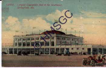|  Accession Number:1997-160  Accession Date:  Condition:fair  Location:archives,bldgs,public,box 2,folder 18  Keywords:Convention Hall,Campbell Ave., Walnut St., College St., City Market, Sears Roebuck, automobile  Area of Origin:Springfield, MO  Period:ca 1910  Category:Documentary Artifact  Object:postcard  Maker:Acmegraph Co., Chicago  Description/History:Color postcard photo of Convention Hall which stood on the former City Lot on S. Campbell Ave. between Walnut Street and College St. The building was later used as the sears roebuck store.  News-Leader Photo Information: |
