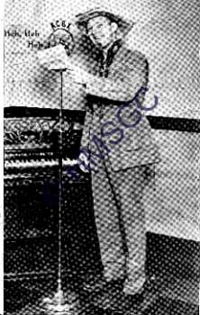 Black and white Advertising photograph of KGBX radio personality pictured wearing farmer hat and fake goatee.