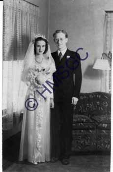 | Accession Number:1997-263 Accession Date: Condition:fair Location:Archives, Photograph Collection, Events, B1, F12 Keywords:, fashion, homes Area of Origin:Springfield, Missouri Period:ca1935 Category:Documentary artifact Object:Print, Photographic Maker:uk Description/History:Black and white Wedding photograph, 5x7, taken in a living room. The bride is wearing a long white dress and a mid-length veil, holding a bouquet with a large central flower. The groom is wearing a dark suit with a white flower in his lapel. The couple is standing next to a window in front of a sofa and lamp. News-Leader Photo Information: |