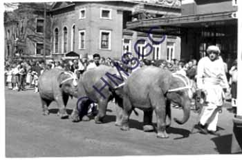 Accession Number:1997-307 Accession Date: Condition:fair Location:archives,photo coll.,events,box 2,folder 11 Keywords:parade,Shrine Circus,Jefferson Ave.,State Hotel,St. Paul Methodist church,elephants Area of Origin:Springfield,MO Period:1954 Category:Documentary Artifact Object:Print, photographic Maker:uk Description/History:Black and white photo of elephants in the Shrine Circus parade moving south on Jefferson Ave. News-Leader Photo Information:
