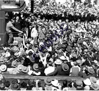 | Accession Number:1997-328 Accession Date: Condition:fair Location:archives,photo coll.,events,box 2,folder 35 Keywords:Thomas E. Dewey, Frisco Depot,railroad car,campaign Area of Origin:Springfield,MO Period:1948 Category:Documentary Artifact Object:Print, photographic Maker:uk Description/History:Black and white photo of a large crowd gathered around a railroad caboose at the Frisco Depot. Presidential hopeful Thomas E. Dewey and another man are standing on the back of the caboose. The other man may be Rep. Charlie Brown. News-Leader Photo Information: |