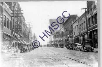 | Accession Number:1998-251 Accession Date: Condition:fair Location: archives, photo coll., streets, box 1, folder 20 Keywords: Boonville Ave., Gottfried Furniture Co., Salvation Army, Sigler Drug Co., Barber College, Lines Music Co., streets, transportation, streetcars Area of Origin:Springfield, Mo. Period:Ca 1925 Category:Documentary Artifact Object:print, photographic Maker:UK Description/History:Looking south of Boonville St. toward the Public Square. On the left side there is Gottfried Furniture store. Next we have the Salvation Army. On the right side there is Sigl-r Drug Co., next is a barber college, next is a bakery and Carpenter Headquarters, ( both in the same building) and last is the Lines Music Co. Boonville St. is brick paved with parallel parking on both sides. Double street car tracks. On the right side of the street is a motor driven piece of Springfield Gas and Electric Co. equipment. 6.5 X 4.5 inches. News-Leader Photo Information: |