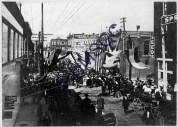 | Accession Number:1998-426 Accession Date: Condition:fair Location:Archives, Photo collection, Streets Box 3 Fldr 31 Keywords:Campbell Ave., Walnut St., horse & buggy, transportation, Springfield Seed Co.Kieffer and Hawkins Furniture, Farmers and Merchants Bank, Dr. George P. Hailey, Dr. Beers Area of Origin:Springfield, MO Period:ca 1896 Category:Documentary artifact Object:Print, photographic Maker:Tippin, 216 1/2 S. Campbell, Spfd, MO Description/History:Black and white photo, mounted on cardboard, of the Corner of Campbell Ave. at Walnut St. looking north, crowded street in front of Springfield Seed Co.Buildings draped for some kind of celebration. News-Leader Photo Information: |