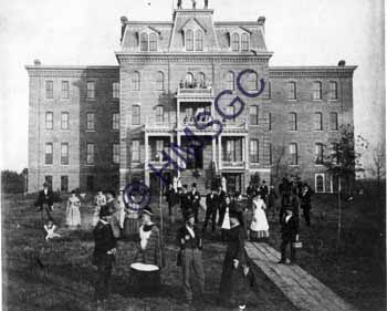 Accession Number:1999-186 Accession Date: Condition:fair Location:archives,photo coll.,schools,box 4,folder 6 Keywords:Drury College, centennial, Fairbanks Hall, Benton Ave. Area of Origin:Springfield, MO Period:1876 Category:Documentary Artifact Object:Print, photographic Maker:uk Description/History:Black and white photo of Fairbanks Hall on the Drury College campus. Students in front are celebrating the U.S. centennial. News-Leader Photo Information: