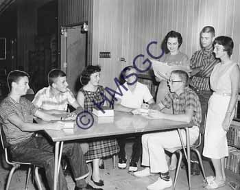 Accession Number:1999-232.45 Accession Date: Condition:good Location:Springfield Public Schools, box 1, folder 45 Keywords:public schools, education, students, class Area of Origin:Springfield, MO Period:ca. 1950 Category:documentary artifact Object:print, photographic Maker: Description/History:A black and white photo of high school students gathered around a table. News-Leader Photo Information: