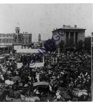 | Accession Number:1999-42-2 Accession Date: Condition:good Location:archives,photo coll.,public square,box 4,folder 9 Keywords:public square, Greene Couty Courthouse, Christian Church, College St., Civil War Reunion, Lyon monument, Caskey Dry Goods, clock Area of Origin:Springfield, MO Period:1883 Category:Documentary Artifact Object:Print, photographic Maker:uk Description/History:Black and white photo of the 1883 Civil War veteran's reunion on the public square. A large crowd is gathered around a reviewing stand. The Lyon monument is visible to the left of the stand wrapped in a flag. Looking west towards College St. News-Leader Photo Information: |