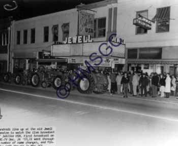 | Accession Number:2000-147-2 Accession Date: Condition:good Location:Archives, Photo Coll., Entert., Box 2, Folder 7 Keywords:Ozark Jubilee, Jewell Theatre, Jubilee U.S.A., Massey-Ferguson Area of Origin:Springfield MO Period:ca 1955 Category:Documentary Artifact Object:Print, photographic Maker:uk Description/History:Black and white photo of the Jewell Theatre at 216 S. Jefferson (at McDaniel Ave.) with tractors parked on the street and a crowd of people waiting. Jubilee U.S.A., a country music show, was televised live by ABC-TV. News-Leader Photo Information: |