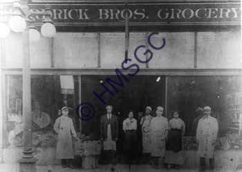 | Accession Number:2000-187-4 Accession Date: Condition:good Location:Archives, Black History Coll., Box 3, Folder 18 Keywords:Hardrick, groceries, African-American, street light. Area of Origin:Springfield MO Period:ca 1910 Category:Documentary Artifact Object:Print, photographic Maker:uk Description/History:Black and white photo of Hardrick Bros. Grocery Store at 230 E. McDaniel Ave. Standing left to right: Ralph Tindall, James Hardrick, uk., Julian Herndon, uk., uk., J.H. Stemmons. Hardrick moved the store in 1907 from 223 St. Louis St. Hardrick and Stemmons were both on the Springfield City Council and School Board. RESTRICTED ACCESS. DO NOT USE WITHOUT PERMISSION. News-Leader Photo Information: |