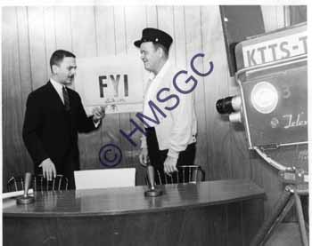 Accession Number:2000-206-30 Accession Date: Condition:fair Location:Archives, Ward Coll., Box 1, Folder 30 Keywords:Jack Elliott, KTTS, television, camera, microphone. Area of Origin:Springfield, Mo. Period:Ca 1965 Category:Documentary Artifact Object:Print, photographic Maker:UK Description/History:Black and white photo of Jack Elliott (L) and a fireman in a KTTS, Channel 10 studio for the program FYI. News-Leader Photo Information: