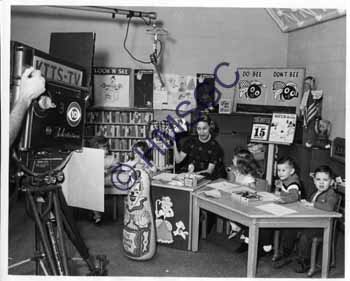 Black and white photo of the Romper Room children's program on KTTS, Channel 10, hosted by " Aunt Rene", Rene Handley.