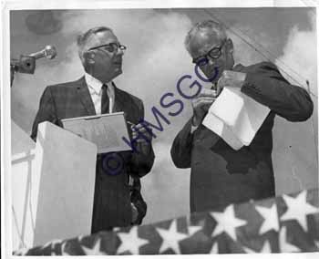 |  Accession Number:2000-206-62  Accession Date:  Condition:fair  Location:archives, Ward Coll., Box 2, folder 2  Keywords:KTTS, politics  G. Pearson Ward,  Barry Goldwater.  Area of Origin:Springfield, MO  Period:Ca 1964  Category:Documentary Artifact  Object:Print, photographic  Maker:uk  Description/History:Black aand white photo of G. Pearson Ward and Barry Goldwater at what appears to be a political rally.  Presumeably around 1964 when Goldwater was the Republican candidate for President.  News-Leader Photo Information: |