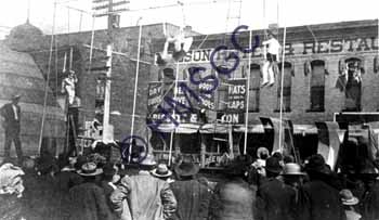 | Accession Number:2000-6 Accession Date: Condition:fair Location:Archives, Photo Coll., Entert., Box 1, Folder 47 Keywords:Street Show, acrobats, Campbell Ave., McDaniel Street, Nelson Hotel and Restaurant, Bissett & Flitton Dry Goods, city lot Area of Origin:Springfield MO Period:ca. 1900 Category:Documentary Artifact Object:Print, photographic Maker:uk Description/History:card with sepia photo mounted in center. Photo of trapeze artists performing at a street fair for large crowd in front of Bissett & Flitton Dry Goods, 312 S. Campbell. News-Leader Photo Information: |