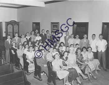 | Accession Number:2001-222-1-11 Accession Date: Condition:fair Location:Archives, Church Hist. Coll., Box 5, Folder 11 Keywords:First & Calvary Presbyterian Church, Sunday school, fashion Area of Origin:Springfield MO Period:1950 Category:Documentary Artifact Object:Print, photographic Maker:uk Description/History:Black and white photo of a High School age church school class at First and Calvary Presbyterian Church, southwest corner of Cherry St. and Dollison Ave. Photographed in their classroom in the undercraft of the church. News-Leader Photo Information: |
