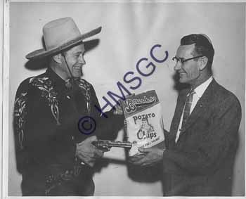 | Accession Number:2001-246 Accession Date: Condition:good Location:Entertainment B-2, F-22 Keywords:KTTS, Cisco Kid, Lloyd Brooks, Brooks Potato Chips, cowboy, gun, actor, television, men, costume, advertising Area of Origin:Springfield, MO Period:ca 1950 Category:Documentary Artifact Object:Print Maker:Midwest Photographers Description/History:Black and white photograph of Lloyd Brooks and the television character the Cisco Kid. This photo was used as an advertisement on KTTS-TV for Brooks Potato Chips. Both men are smiling, but it is supposed to show Cisco Kid taking a package of Brooks Chips from Lloyd Brooks at gunpoint. News-Leader Photo Information: |