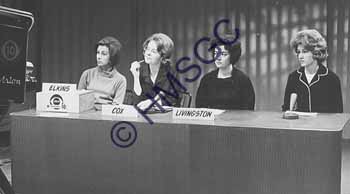 Accession Number:2001-51.105 Accession Date: Condition:good Location:Ward, box 3, folder 95 Keywords:Ward, Chancellor, KTTS, television, radio, panal, women, candidates, Cox, Livingston, Elkins Area of Origin:Springfield, MO Period:ca. 1960 Category:documentary artifact Object:print, photographic Maker:Chuck Beach Description/History:A black and white photo of four women on "Meet the Candidates". News-Leader Photo Information: