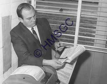 Accession Number:2001-51.156 Accession Date: Condition:good Location:Ward, box 4, folder 72 Keywords:Ward, KTTS, television, radio, Chancellor, Peters, men Area of Origin:Springfield, MO Period:ca. 1950 Category:documentary artifact Object:print, photographic Maker:uk Description/History:A black and white photo of Milt Peters. News-Leader Photo Information: