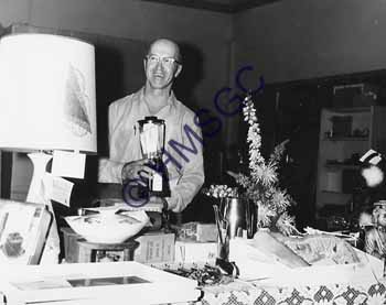 Accession Number:2001-51.176 Accession Date: Condition:good Location:Ward, box 4, folder 55 Keywords:Ward, KTTS, television, radio, Chancellor, Glasscock, men Area of Origin:Springfield, MO Period:ca. 1950 Category:documentary artifact Object:print, photographic Maker:uk Description/History:A black and white photo of Harold Glasscock holding a blender. News-Leader Photo Information: