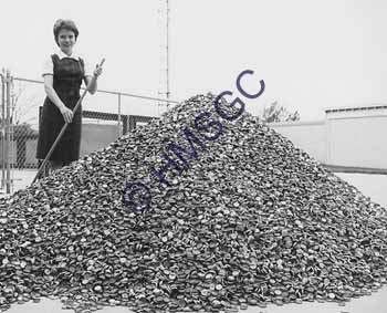 Accession Number:2001-51.188 Accession Date: Condition:good Location:Ward, box 4, folder 67 Keywords:Ward, KTTS, television, radio, Chancellor, women, bottle caps, Barnes, Swanson Area of Origin:Springfield, MO Period:ca. 1950 Category:documentary artifact Object:print, photographic Maker:uk Description/History:A black and white photo of Billie Swanson standing next ot a pile of bottle caps. News-Leader Photo Information: