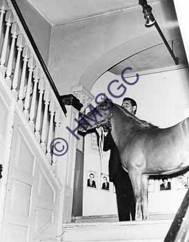 Accession Number:2001-51.190 Accession Date: Condition:good Location:Ward, box 4, folder 69 Keywords:Ward, KTTS, television, radio, Chancellor, horse, McAndrews, men Area of Origin:Springfield, MO Period:ca. 1950 Category:documentary artifact Object:print, photographic Maker:uk Description/History:A black and white photo of Kevin McAndrews and a horse standing in side near a staircase. News-Leader Photo Information: