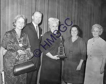 Accession Number:2001-51.208 Accession Date: Condition:good Location:Ward, box 4, folder 88 Keywords:ward, KTTS, television, radio, Chancellor, people, Cox, trophy, award Area of Origin:Springfield, MO Period:ca. 1965 Category:documentary artifact Object:print, photographic Maker:uk Description/History:A black and white photo of KTTS group. Mary Elizabeth Cox (center) holding trophy that reads: "Women of Achievement Award - 1965". News-Leader Photo Information: