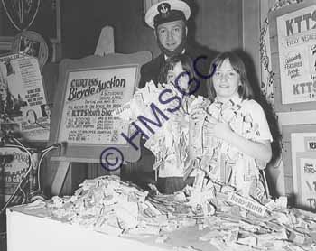 A black and white photo of KTTS Captain Briney and kids holding Baby Ruth wrapers.