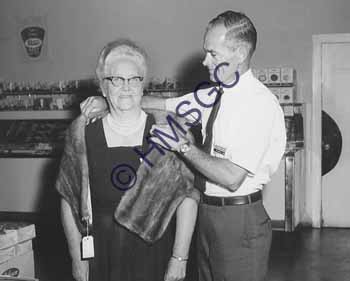 | Accession Number:2001-51.225 Accession Date: Condition:good Location:Ward, box 4, folder 105 Keywords:Ward, KTTS, television, radio, Chancellor, couple, fur, pearls, store, shopping, purchase, Comstock Area of Origin:Springfield, MO Period:ca. 1960 Category:documentary artifact Object:print, photographic Maker:Comstock and Son Description/History:A black and white photo of an elderly woman with glasses wearing a fur stoll with a price tag on it. The store manager (right) aids in wrapping it around the woman's shoulders. News-Leader Photo Information: |