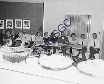 Accession Number:2001-51.228 Accession Date: Condition:good Location:Ward, box 4, folder 108 Keywords:Ward, KTTS, television, radio, Chancellor, people Area of Origin:Springfield, MO Period:ca. 1960 Category:documentary artifact Object:print, photographic Maker:uk Description/History:A black and white photo of a group of people seated around several tables. Buffet in foreground. News-Leader Photo Information: