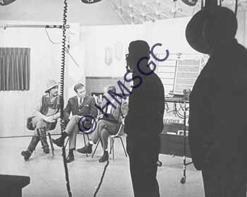 A black and white photo of an interview with Gunsmoke stars: Sherlus Walpole and Milburn Stone.