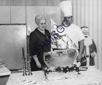 |  Accession Number:2001-51.269  Accession Date:  Condition:good  Location:Ward, box 5, folder 39  Keywords:KTTS, television, radio, Chancellor, Ward, chef, ship, College of Cooking, food, Cox  Area of Origin:Springfield, MO  Period:ca. 1960  Category:documentary artifact  Object:print, photographic  Maker:uk  Description/History:A black and white photo of Mary Elizabeth Cox (College of Cooking) with chef.  They stand behind an ice sculpture of a ship.  News-Leader Photo Information: |