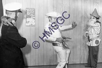 A black and white photo of Captain Briny, cowboy, and clown.